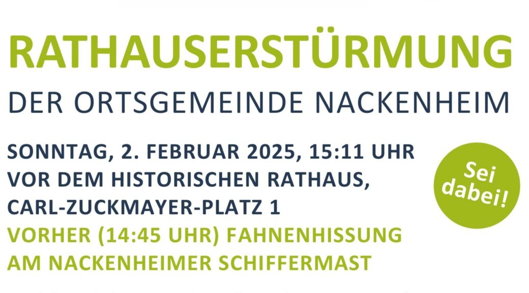 Auch in diesem Jahr werden der Carnevalverein Entenbrüder und die Kath. Jugend Nackenheim die heiße Phase der Fastnachtskampagne mit der Rathauserstürmung am Sonntag, 02. Februar 2025, um 15:11 Uhr* einläuten