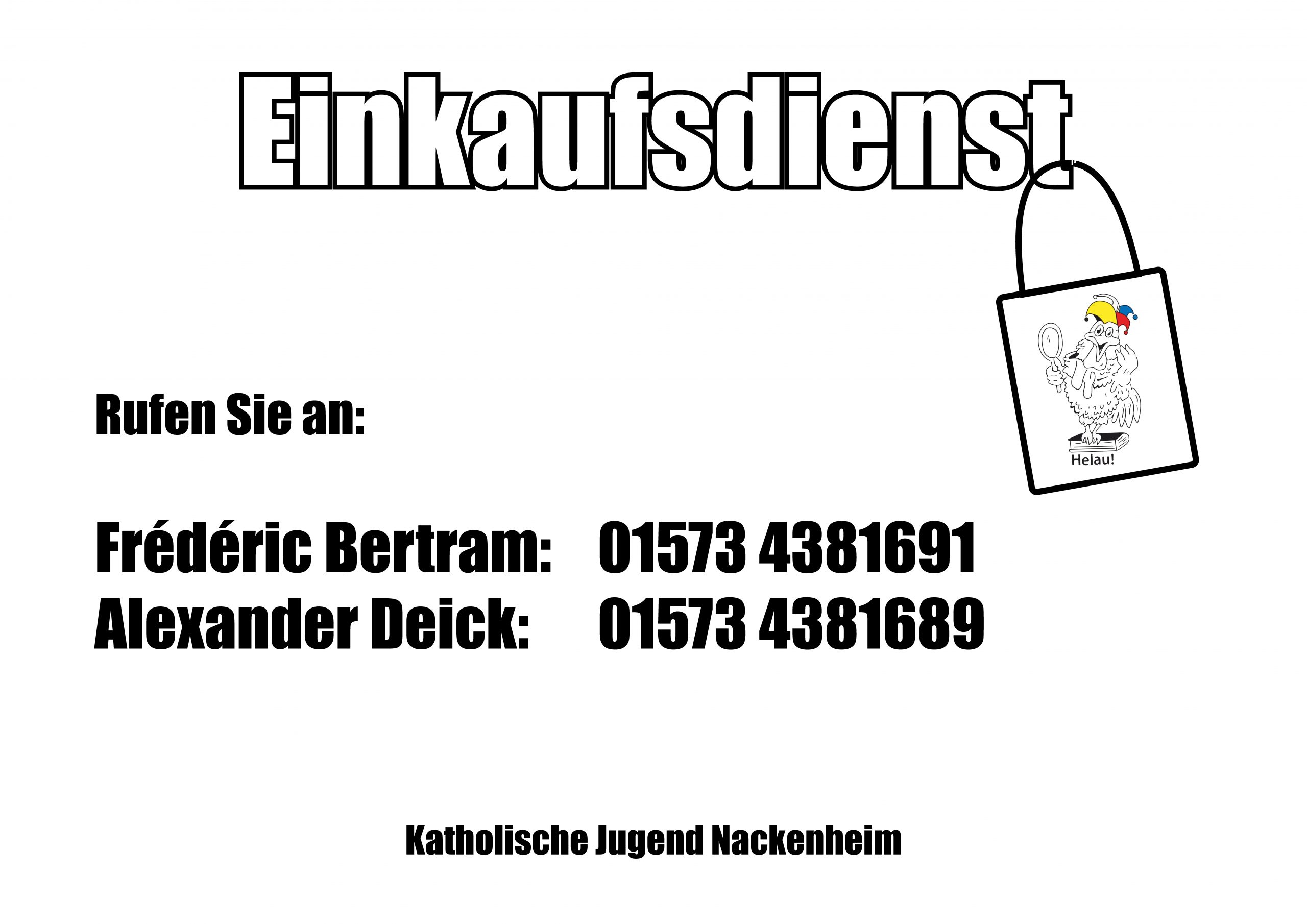 Gesundheitsexperten raten deshalb Menschen aus der sogenannten Risikogruppe, also in höherem Lebensalter und mit Grunderkrankungen, dazu, zu Hause zu bleiben, um einem eventuellen lebensbedrohlichen Krankheitsverlauf vorzu- beugen. Diesen Menschen möchte die Leiterrunde der Katholischen Jugend Nackenheim anbieten, Einkaufs- und Besorgungsfahrten zu übernehmen.