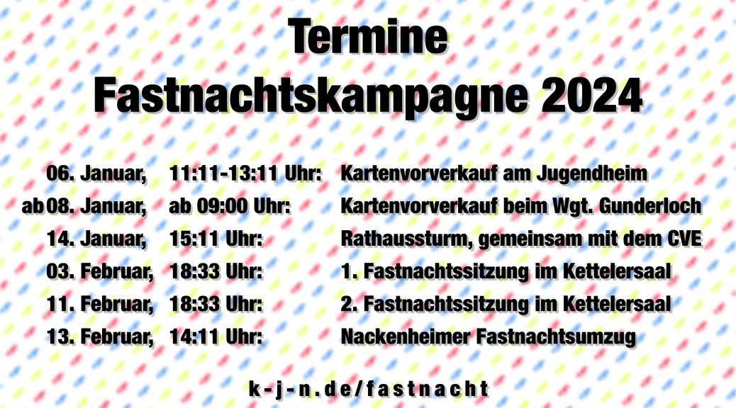 Nähere Infos, vor allem zum Motto, folgen noch. Auf Instagram und Facebook, (jeweils unter @kjnackenheim) sowie hier, auf unserer Webseite, seid ihr immer top informiert. Natürlich werden auch die Plakate in Nackenheim bald kaum zu übersehen sein…