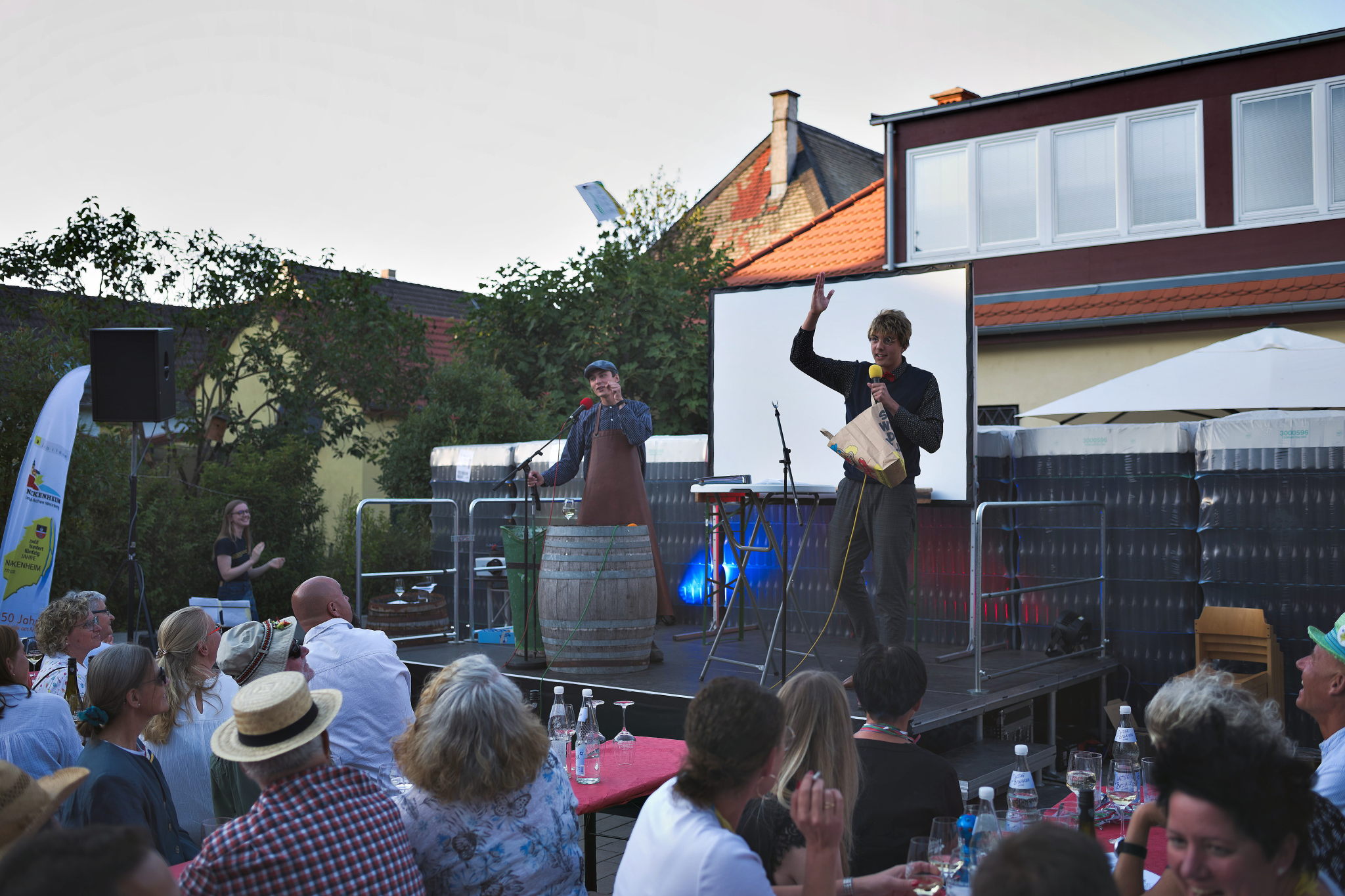 Unter diesem Motto stand unsere Weinprobe, die mit einem erfrischendem Secco zum Eintrinken vom Weingut Marbé-Sans und einer kurze Begrüßung durch unsere Moderatorin Allegra Bob, ihren Lauf nahm. Auf die gut 200 Gäste warteten darüberhinaus sechs Weine, die jeweils von einer kurzen Einleitung und einem Sketch begleitet wurden.