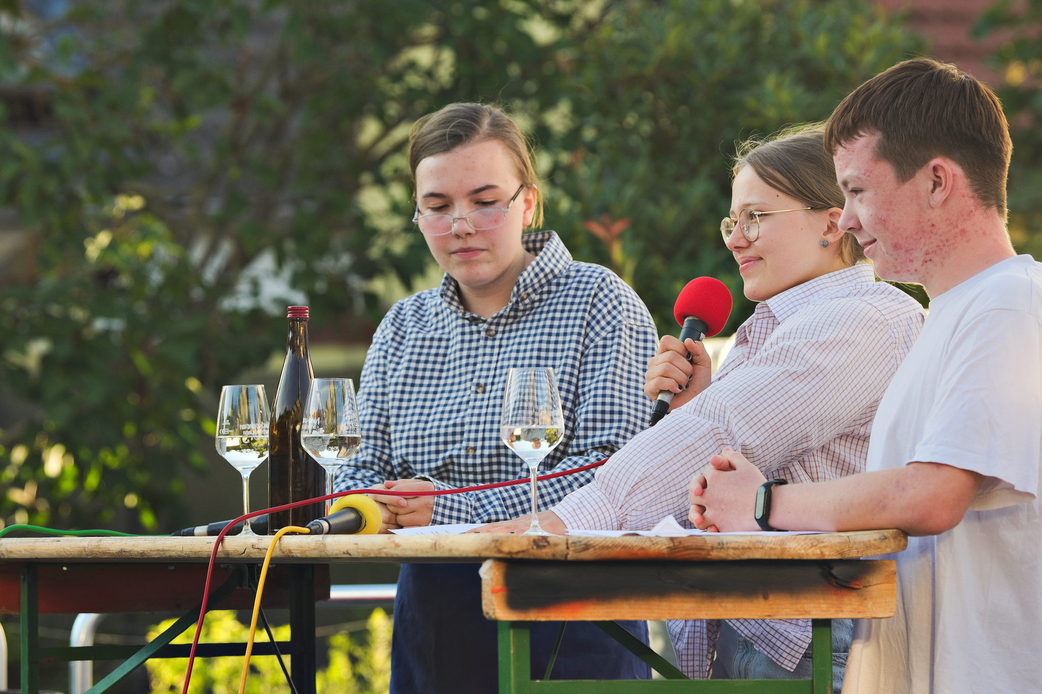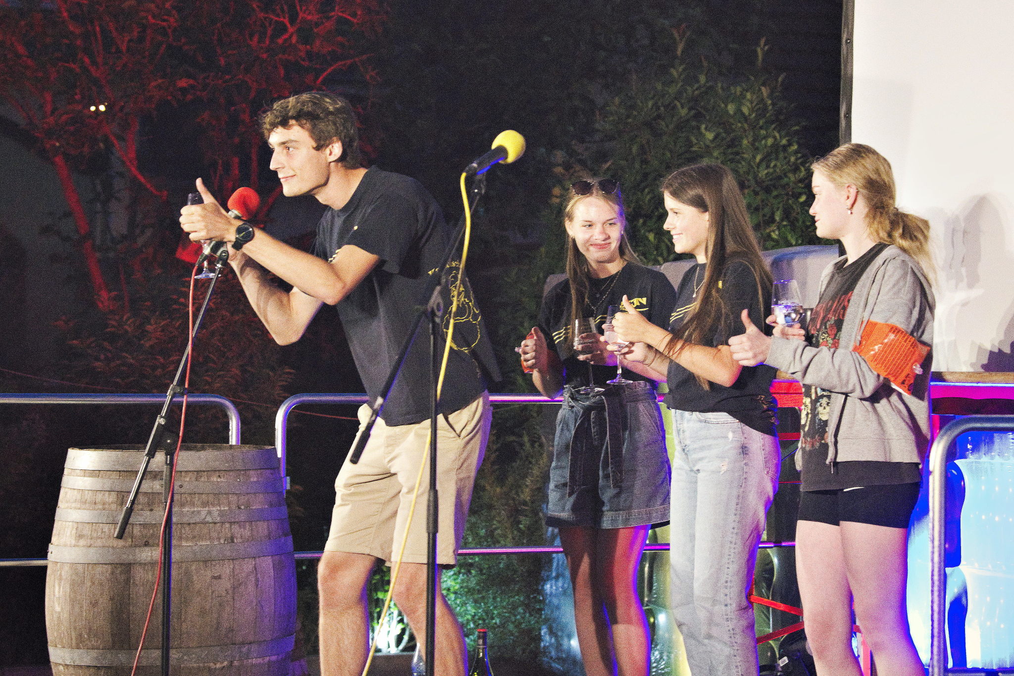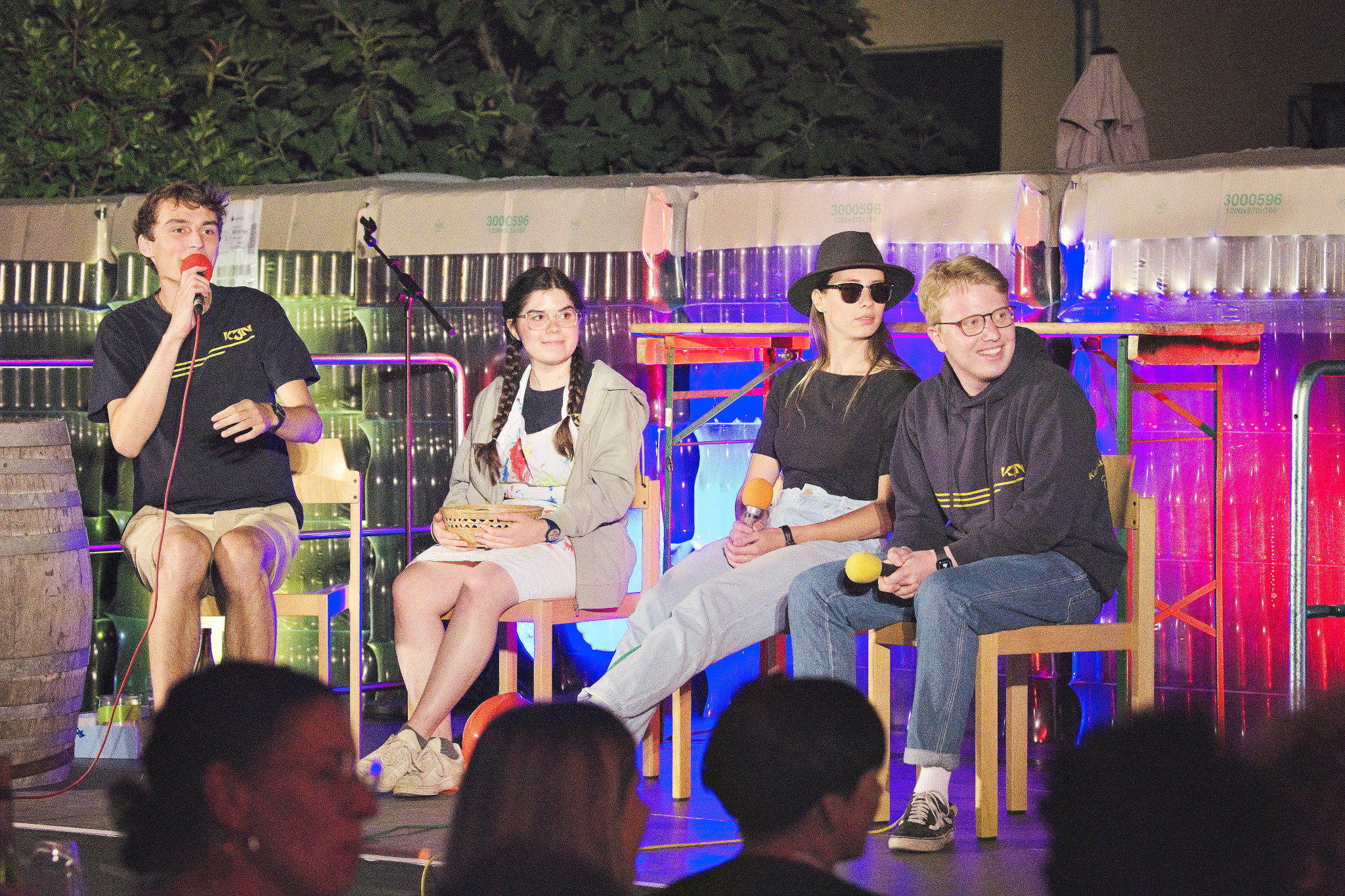 Auch wenn dieser nicht zu unserem Weinprogramm gehörte, sangen die jüngsten Gruppenstunden gemeinsam dieses Lied, um die Zuschauer:innen auf Touren zu bringen – dieses Unterfangen gelang auch. Im weiteren Verlauf des Abends wurde KJN-typisch das Ortsgeschehen aufgenommen und humoristisch aufgearbeitet. So befassten sich René Adler (Livia Marbé-Sans), Volker Hassemer (Maria Spengler) und Otto Sans (Sebastian Treber) gemeinsam im Schützenhof mit der Zukunft Nackenheims. Alexander Deick, der gemeinsam mit Allegra Bob moderierte, präsentierte sich als Buddeemännje und traf in dieser Rolle auf Karl Lauterbach (Ben Deick). Darüber hinaus gab es eine kurze Einlage in Wein-Aerobic und das Publikum wurde mit einem interaktiven Quiz auf die Probe gestellt.