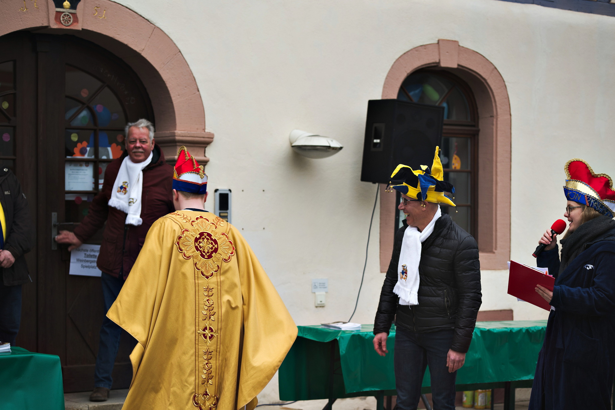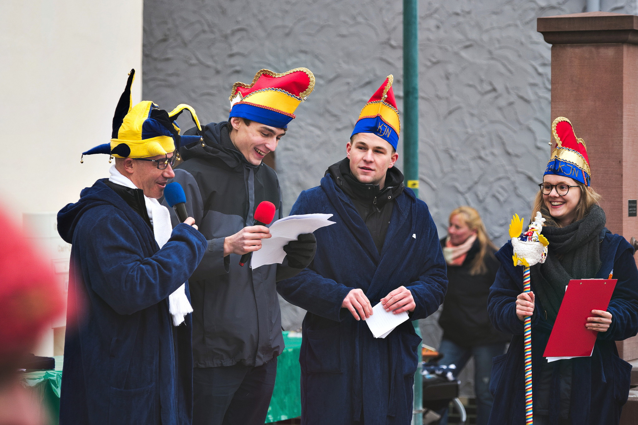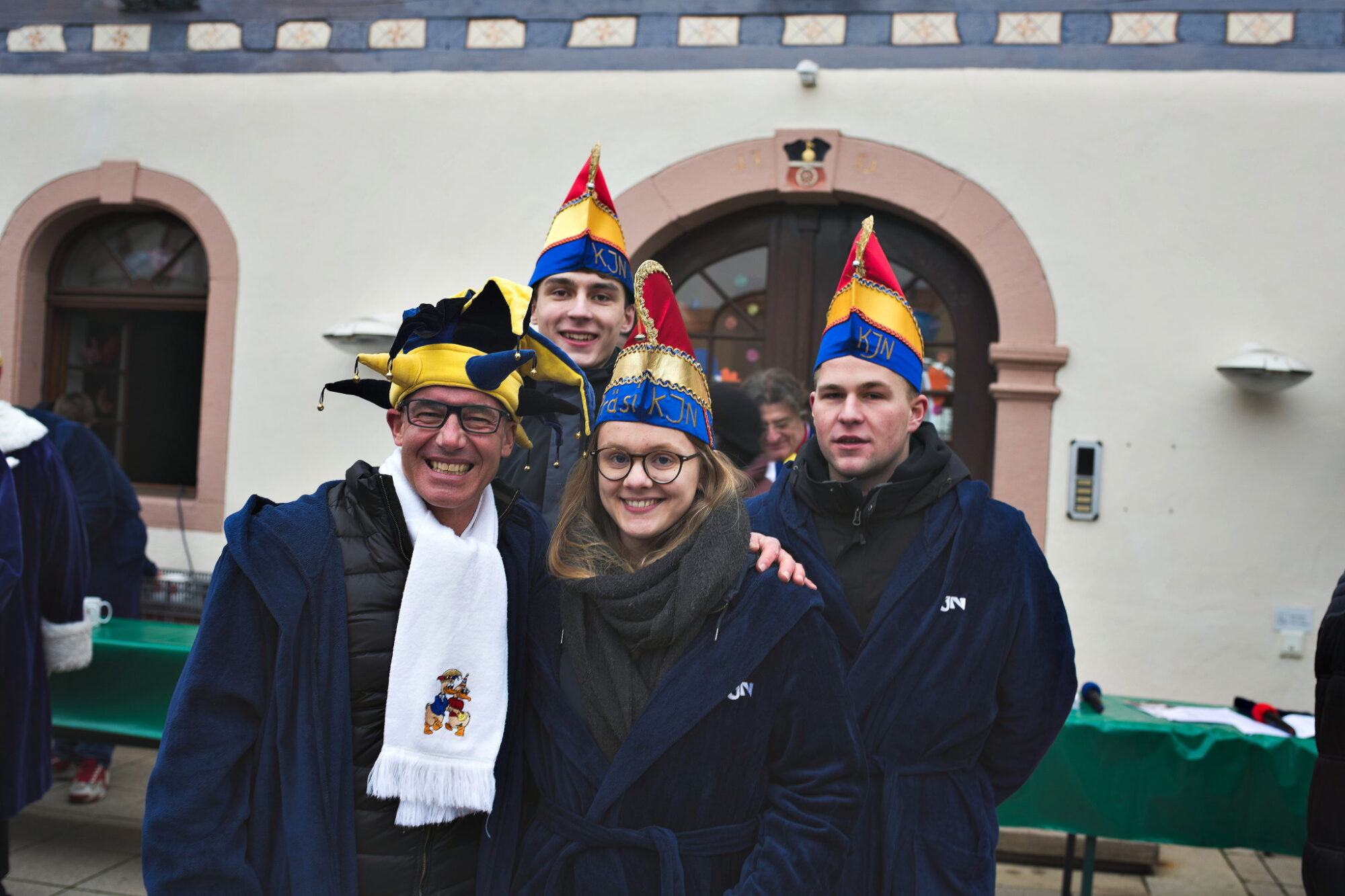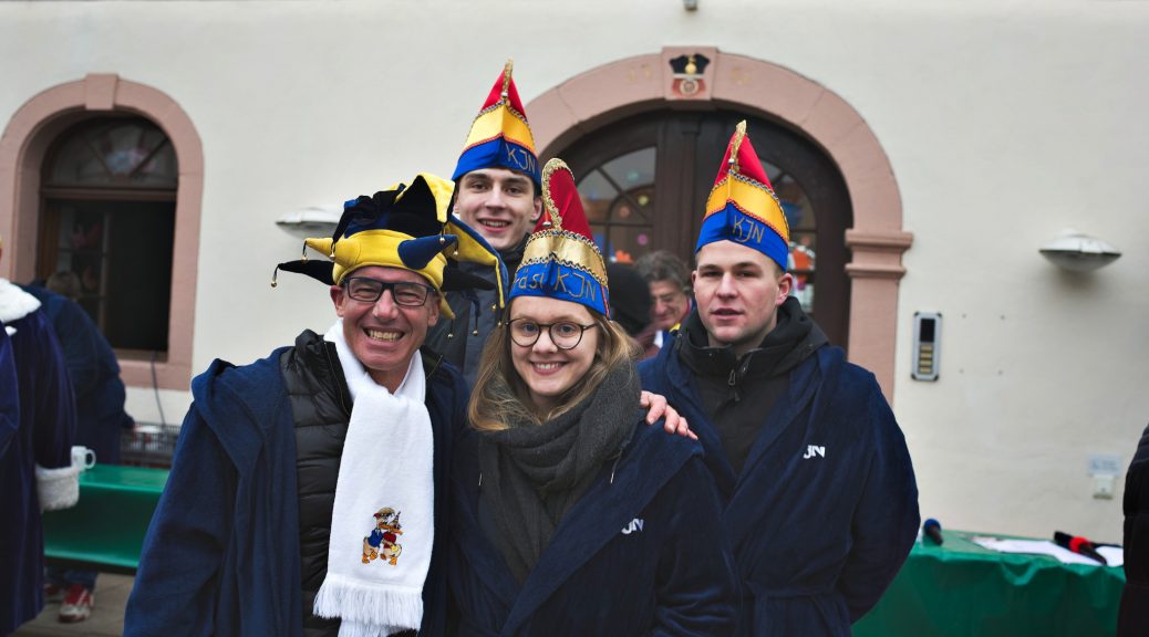 Dieses Jahr musste sich auch unser neuer Bürgermeister René Adler der alten Tradition des Rathaussturms unterziehen. Nachdem er die eindringlichen Aufforderungen und schlagfertigen Argumente des CVE vernommen hatte, erklärte er sich schließlich dazu bereit, sein Amt bis zum Aschermittwoch niederzulegen und die Macht den Närrinnen und Narrhallesen zu überlassen. Wir als KJN nutzten die Gelegenheit, um unserem frisch entmachteten Ortsbürgermeister stattdessen das sehr begehrte Amt des KJN-Schatzmeisters anzubieten. Ein Narrenpriester stand zwar bereit, um die dafür eigentlich notwendigen Narren-Sakramente zu spenden, allerdings verzichteten wir dieses Mal lieber auf sakramentale Handlungen. René Adler musste nur eine Bewerbungsrede halten, die wir gemeinsam ganz spontan mit ihm schrieben. Dafür musste er elf mehr oder weniger persönliche Fragen beantworten, die Antworten wurden dann in einen vorgefertigten Lückentext eingetragen. Das Ergebnis war eine sehr überzeugende Rede, aufgrund der wir uns dazu entschieden, ihm dieses Amt zu vermachen. Wie der Name „SCHATZmeister“ schon sagt, muss der Bürgermeister sich deshalb nun während der KJN-Sitzung um seine Amtsvorgängerin Margit Grub kümmern. Die ganze Jugend wünscht ihm hierbei viel Erfolg und vor allem viel Kraft für diese Aufgabe!