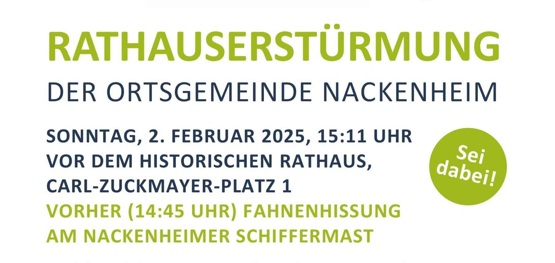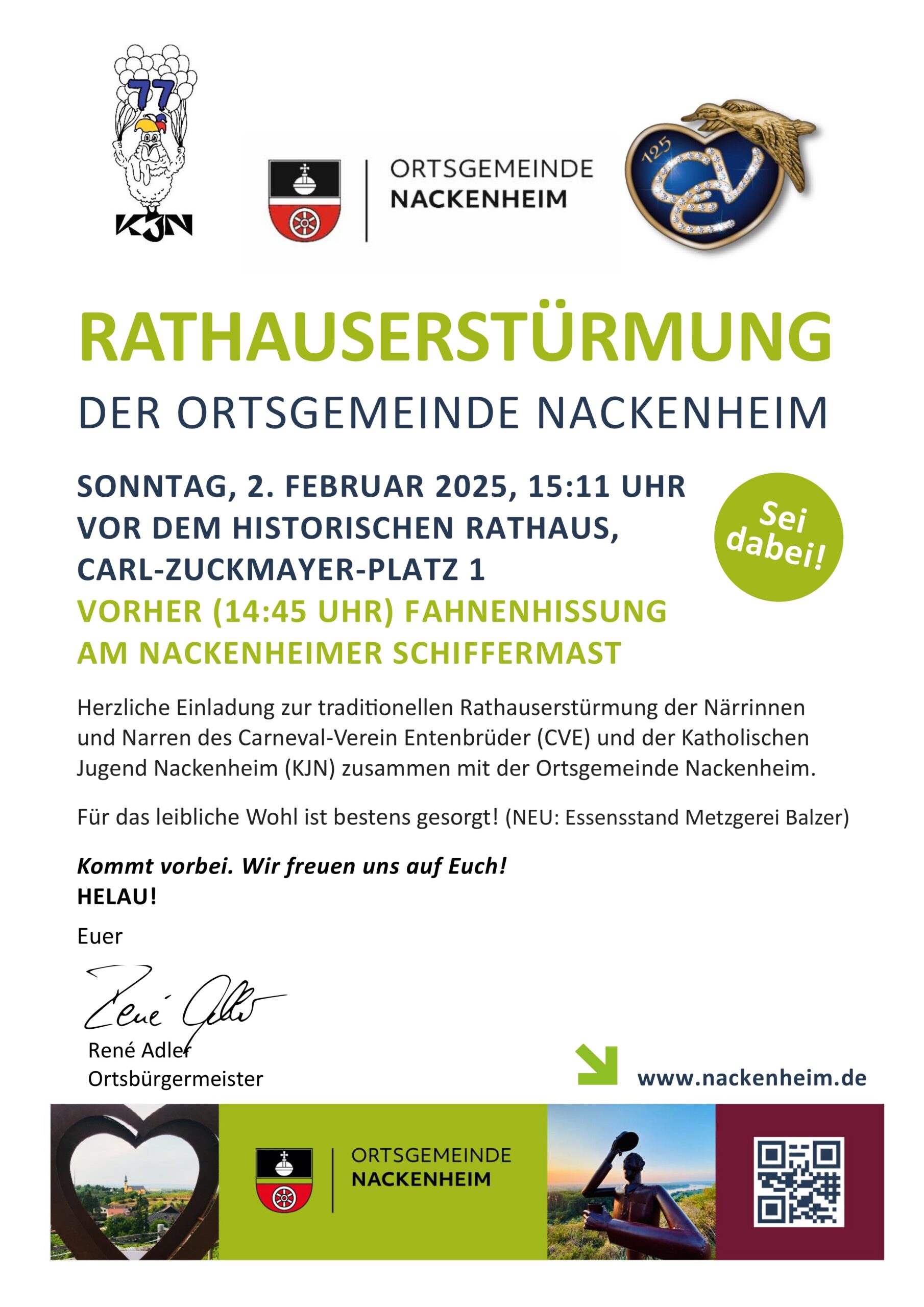 Auch in diesem Jahr werden der Carnevalverein Entenbrüder und die Kath. Jugend Nackenheim die heiße Phase der Fastnachtskampagne mit der Rathauserstürmung am Sonntag, 02. Februar 2025, um 15:11 Uhr* einläuten