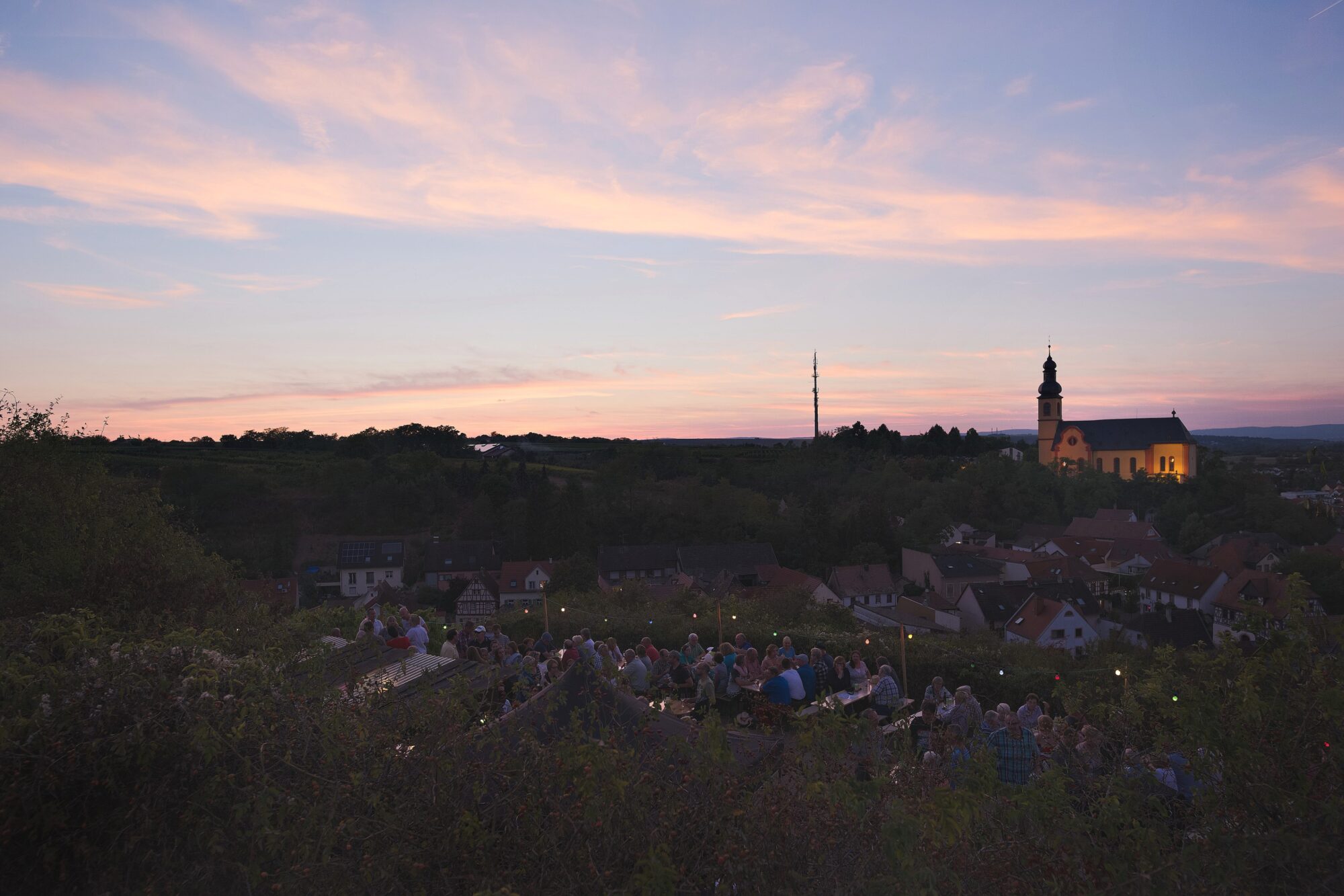 Wege. Bei einem Gläschen Wein und hervorragendem Essen vom Catering „Lions Live“ ließen es sich die Gäste auf dem wohl schönsten Fleckchen, das Rheinhessen zu bieten hat, gut gehen. Nicht nur Nackenheimer, sondern auch Auswärtige kamen in den Fröhlichen Weinberg, um sich einen geselligen Abend zu machen. „Super Wetter, tolle Aussicht. Immer wieder gerne!“, so einer der Besucher. Mit einer Gesangseinlage des Männergesangsvereins 1857 wurde das Fest am Freitagabend eröffnet. Der gesangliche Anfang motivierte auch die Gäste zu vorangegangener Stunde und dem ein oder anderen Glas Wein, ein Liedchen anzustimmen. Denn was ist schöner, als den Wein dort zu trinken, wo er wächst und dabei noch die urige Gemütlichkeit dieser wunderbaren Location genießen zu können? Dieses Jahr neu war auch der Verkauf von Federweißem, der aufgrund des heißen Sommers besonders früh angeboten werden konnte und daher besonders beliebt war. Am Samstagabend begann das Fest mit einem besonderen Highlight, das es so mit Sicherheit nur in Nackenheim gibt. Es wurde ein von der Jugend vorbereiteter Gottesdienst mit dem Nackenheimer Pfarrer unter freiem Himmel an der Bergkapelle gefeiert. Da es diesen besonderen Gottesdienst wahrscheinlich nur noch einmal im Jahr geben wird, waren auch diesmal die Bänke wieder gut gefüllt. Zusammen mit der Kinderkirche ergab sich zu Schluss ein besonders schönes Bild. Anschließend wurden die Bänke gemeinsam wieder auf die Koppel getragen und man ließ den Letzten der beiden Festabende gemütlich ausklingen.